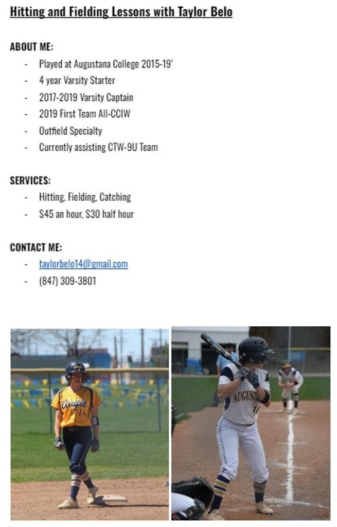 | Taylor Belo | Hitting/Fielding/Catching | taylorbelow14@gmail.com |